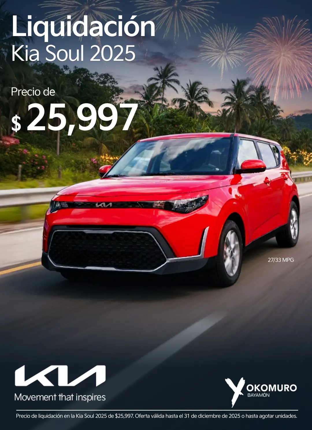 La promoción “GOzando(compra y gana)” comienza el 1 de diciembre de 2025 y finalizará el 31 de diciembre de 2025. Yokomuro LLC D.B.A. Yokomuro Kia (en adelante referidos como “La Marca” o “Promotor”) estará llevando a cabo esta promoción y sorteo en Puerto Rico, publicando la información e instrucciones a través de sus páginas web y redes sociales, incluyendo Facebook e Instagram. La participación automática se obtiene al comprar un auto, pieza, accesorio o acudir a servicio en Yokomuro Kia durante diciembre de 2025. Cada participante contará sólo una vez, independientemente de que realice más de una compra o más de un servicio. Todo participante deberá ser mayor de dieciocho (18) años al momento de participar; de lo contrario será descalificado automáticamente.